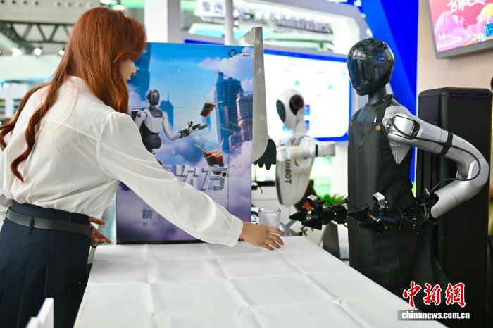 9月19日,工作人員正在與2025世界制造業大會上展出的機器人互動。中新社記者 韓蘇原 攝