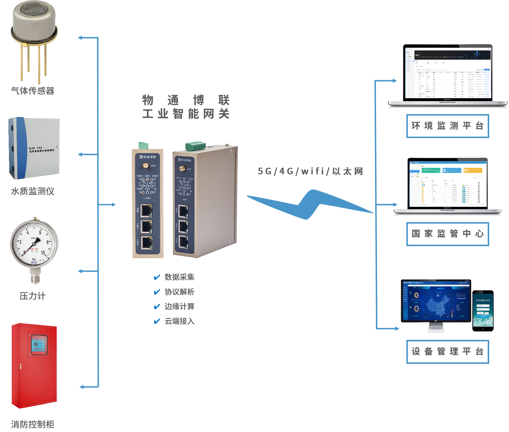 工業(yè)網(wǎng)關(guān)為核心,通過RS485/RS232、以太網(wǎng)等接口對(duì)接風(fēng)機(jī)控制系統(tǒng)的PLC、溫濕度傳感器、變頻器及智能電表等,實(shí)時(shí)采集溫濕度數(shù)據(jù)與風(fēng)機(jī)運(yùn)行參數(shù),經(jīng)5G/4G/WIFI等傳輸至云端平臺(tái)或本地上位機(jī),平臺(tái)實(shí)現(xiàn)可視化監(jiān)控管理,并能通過網(wǎng)關(guān)下發(fā)至風(fēng)機(jī)系統(tǒng)實(shí)現(xiàn)動(dòng)態(tài)調(diào)控,形成“采集-監(jiān)控-調(diào)控-管理”閉環(huán),保障車間環(huán)境安全可靠。