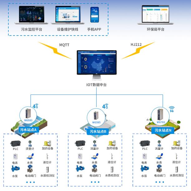 基于日常巡檢與遠程維護的需求,物通博聯提供基于工業智能網關的解決方案。通過將污水處理PLC、DLT智能電表、智能攝像頭等設備接入到網關,網關能夠實時采集污水處理工藝參數、能耗以及實時視頻等數據,并通過4G網絡和MQTT協議對接到集團運維管理平臺中,從而實現遠程監控、遠程控制、遠程抓拍、遠程維護等功能,從而實現智慧運維管理,促進降本增效目標的實現。