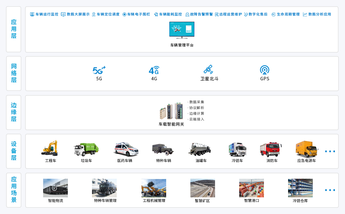 物通博聯(lián)針對特種車輛數(shù)字化需求,以車載智能網(wǎng)關(guān)為核心,實時采集車輛行駛參數(shù)、動力系統(tǒng)狀態(tài)、作業(yè)設(shè)備工況等關(guān)鍵數(shù)據(jù),通過邊緣側(cè)本地化計算完成數(shù)據(jù)清洗、格式標(biāo)準(zhǔn)化處理。再依托 5G/4G 無線通信或北斗網(wǎng)絡(luò),將標(biāo)準(zhǔn)化數(shù)據(jù)上傳至特種車輛管理平臺。平臺實現(xiàn)車輛位置實時追蹤、運行狀態(tài)遠(yuǎn)程監(jiān)控、異常情況及時預(yù)警,為特種車輛高效調(diào)度與安全管理提供技術(shù)支撐。