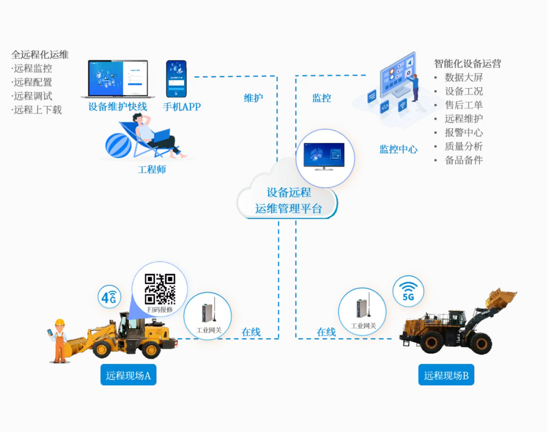 物通博聯提供工業智能網關與設備運維管理平臺搭建的裝載機遠程監控智慧運維系統,實現了對分布式設備的全方位、全天候、全生命周期智慧化管理,不僅降低了企業的運維成本與運營風險,提升了核心競爭力,還增強了與客戶的交互協同,提高了用戶滿意度,為智能裝備行業的高質量發展提供了有力保障。